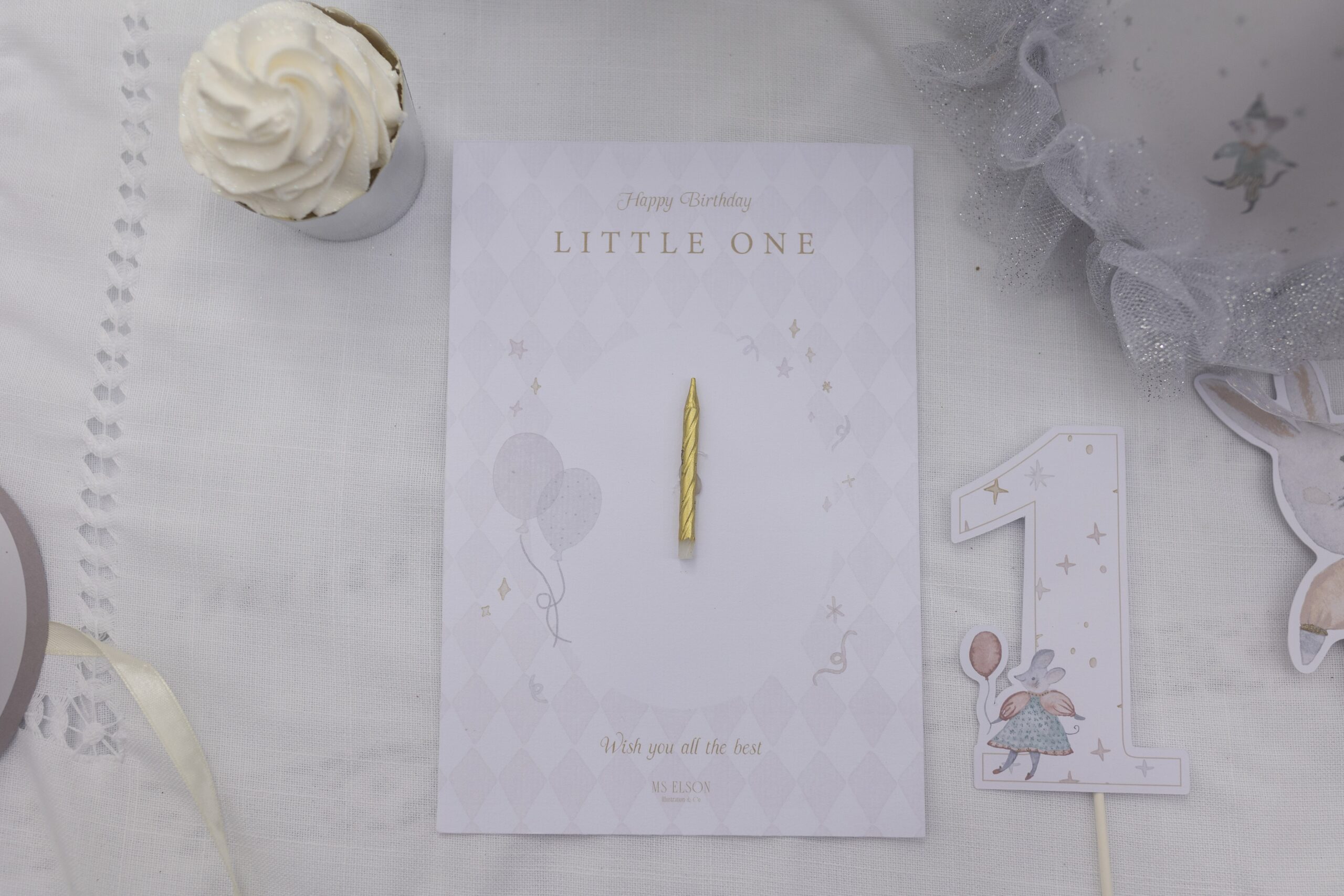 כרטיס ברכה מאויר עם איור צבעי מים מבית Ms Elson, כולל נר מצורף מודבק לכרטיס, ניתן להסרה ושימוש על העוגה.