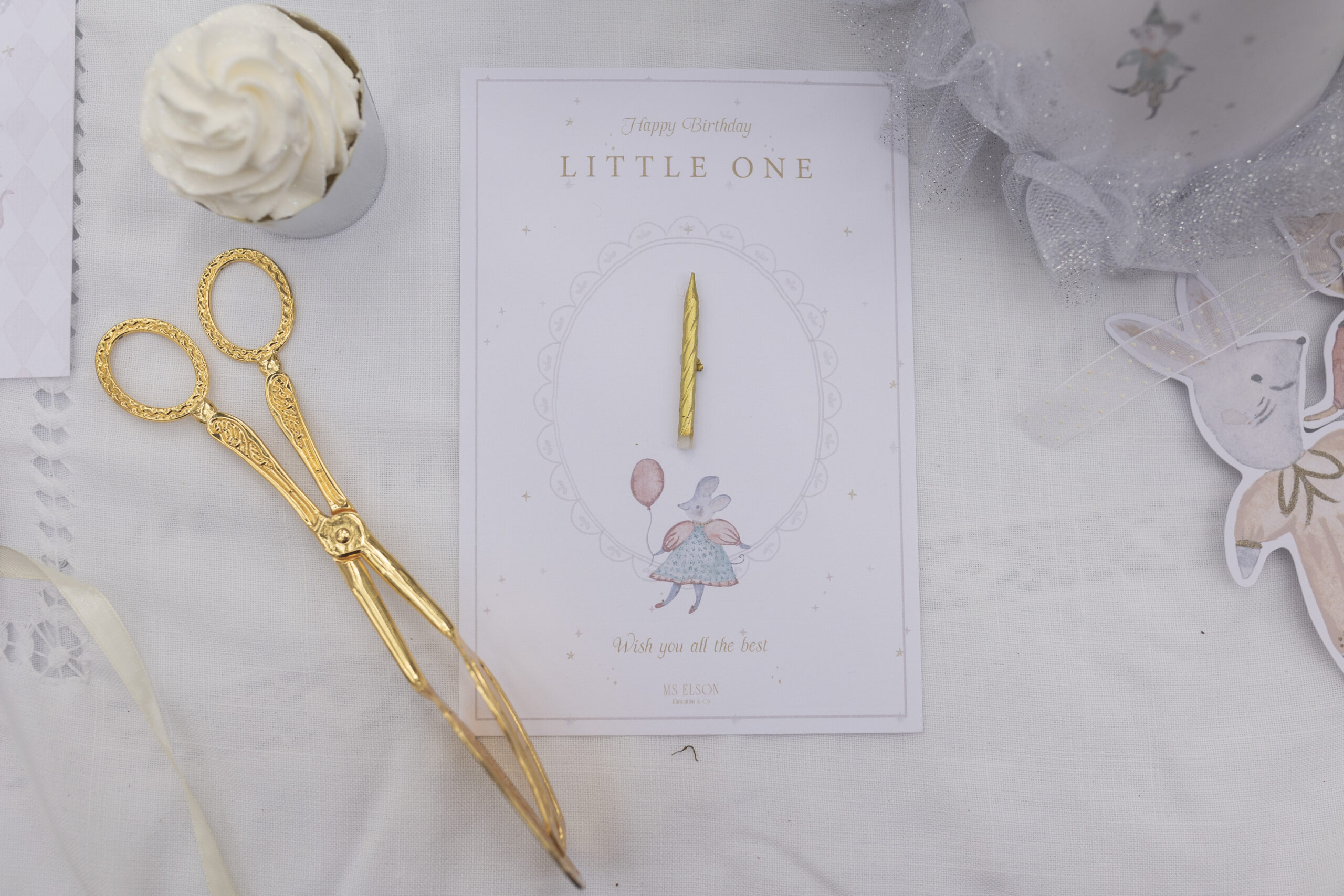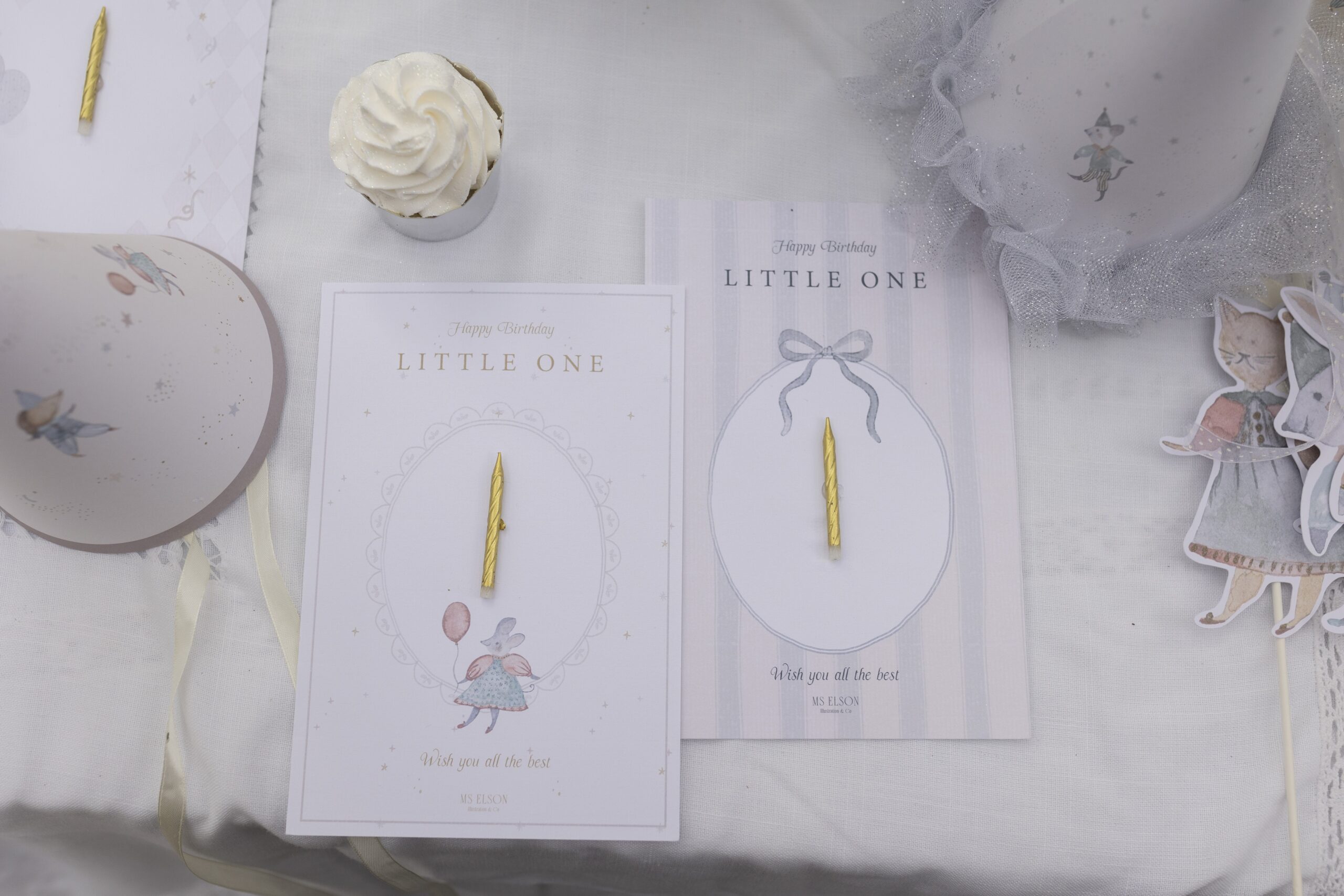 כרטיס ברכה מאויר עם איור צבעי מים מבית Ms Elson, כולל נר מצורף מודבק לכרטיס, ניתן להסרה ושימוש על העוגה.
