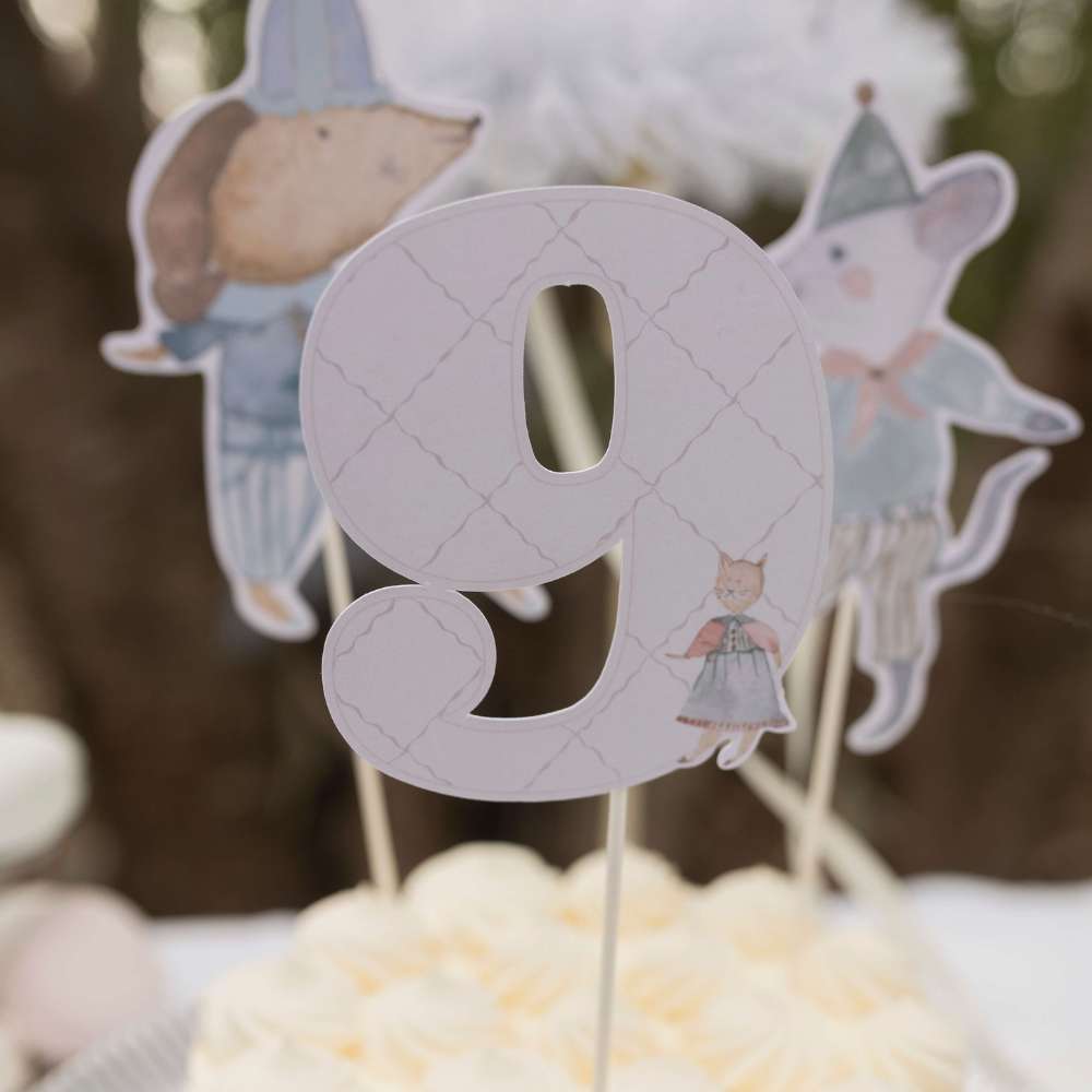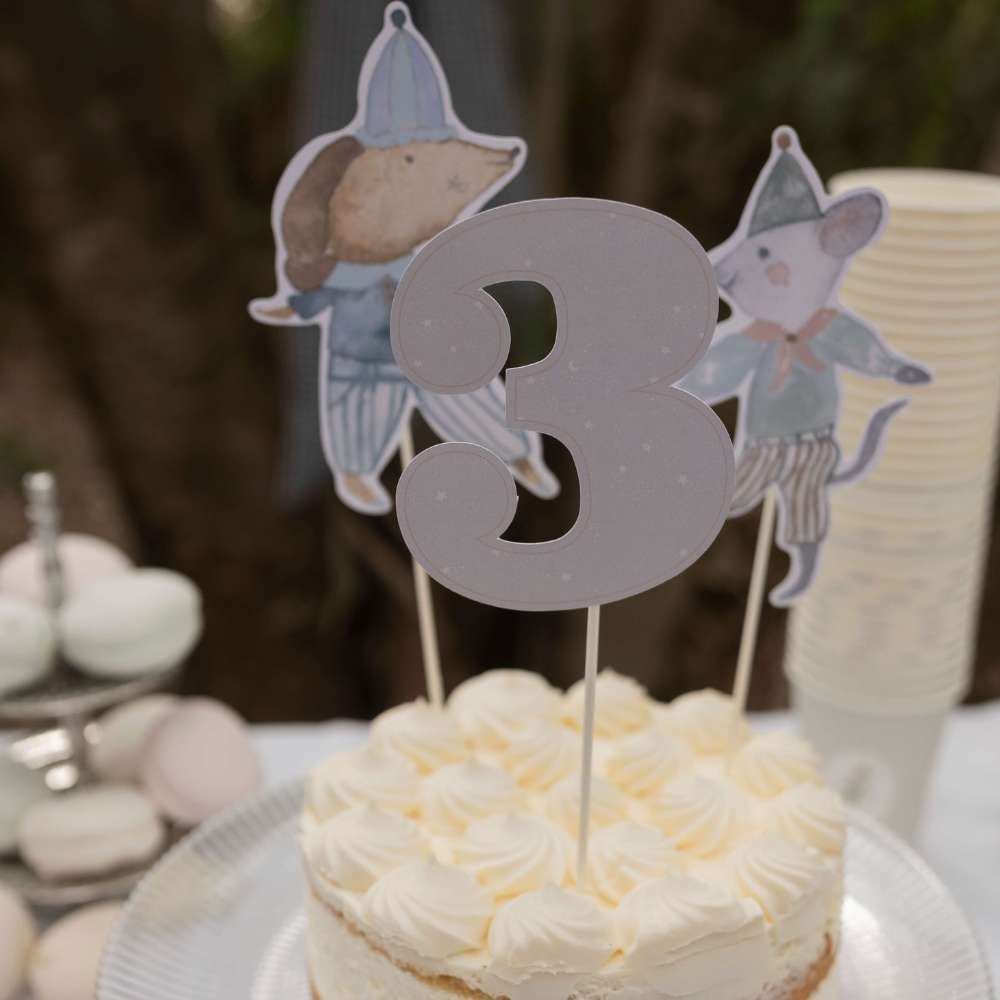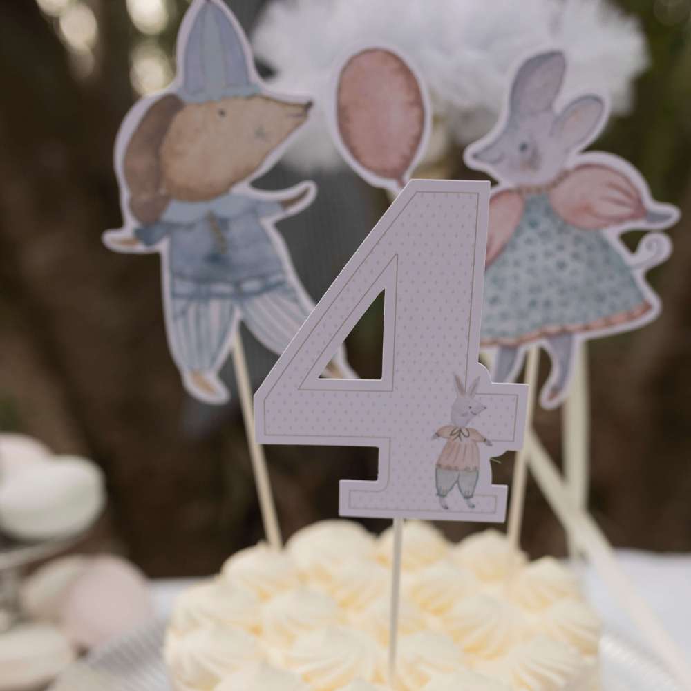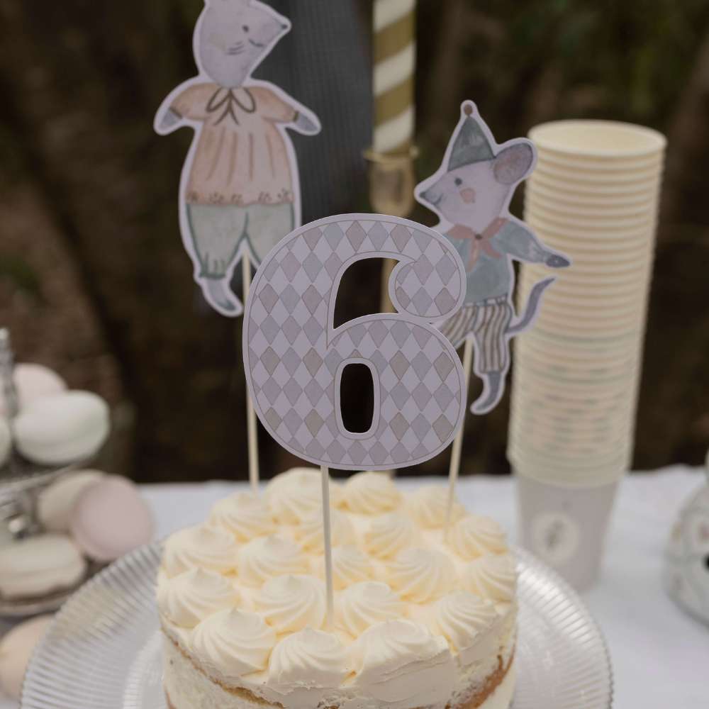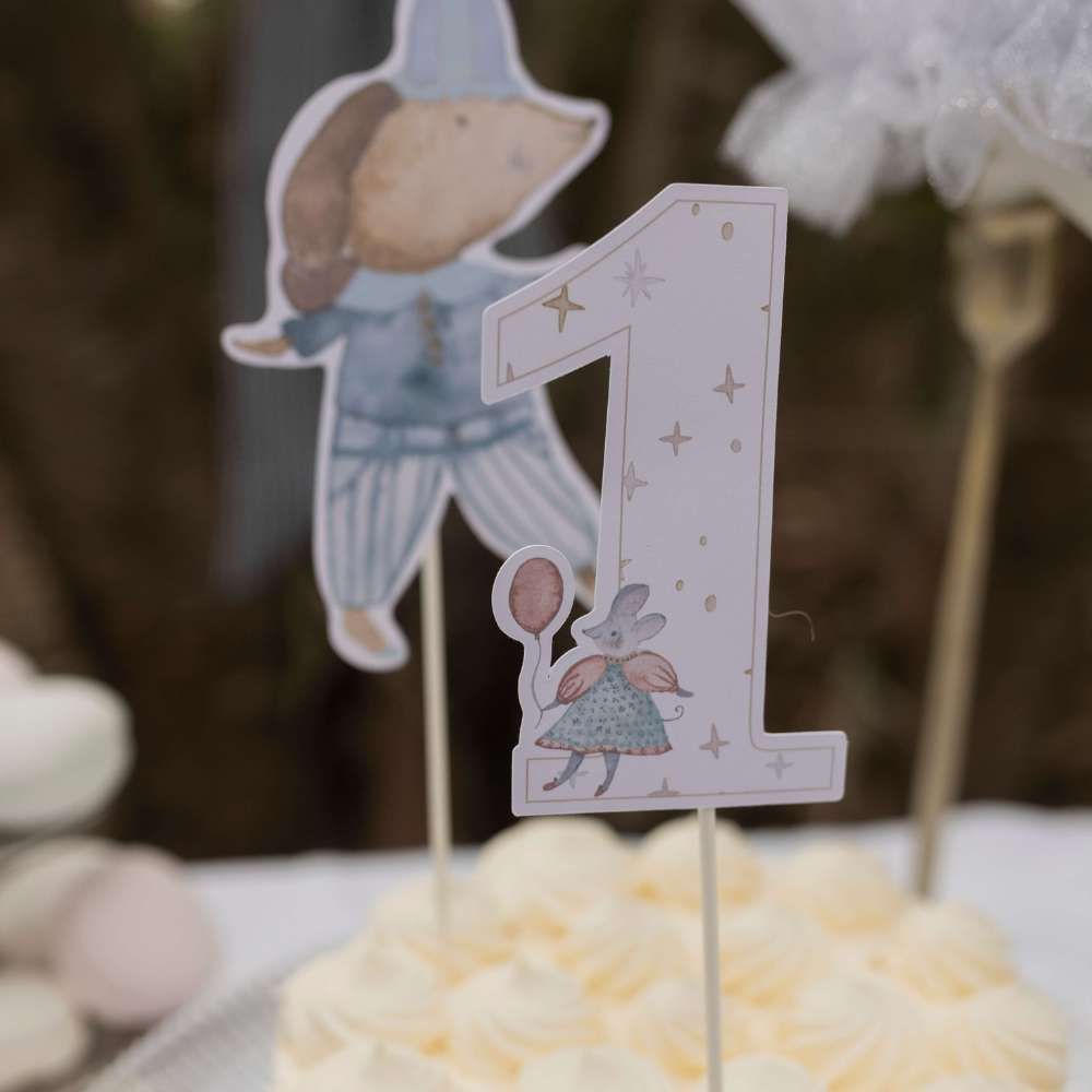 טופר מספר מאויר בודד עם איור צבעי מים ודמויות, לקישוט עוגות וקאפקייקס — חלופה מעוצבת לנר מספר.